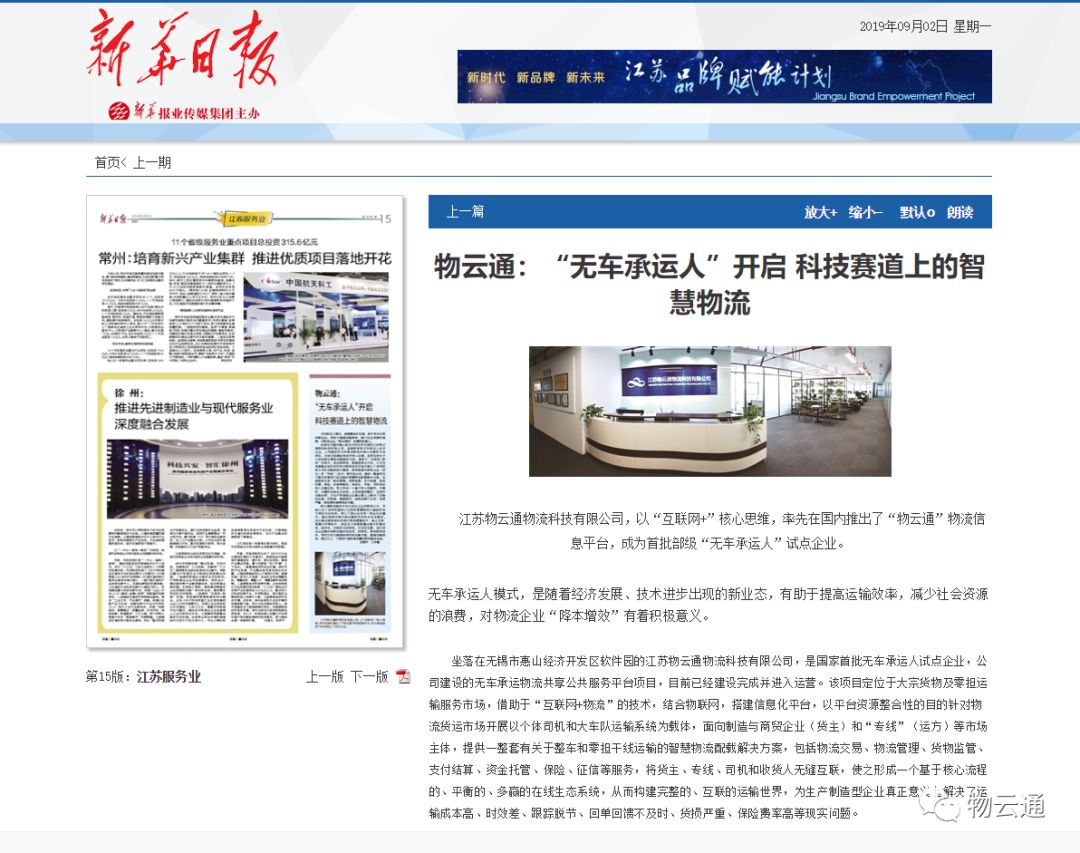 2019年9月2日(星期一)新华日报刊登了有关物云通无车承运人的报道,文章中主要阐述了物云通所实施的无车承运模式对现代服务业所产生的积极作用。